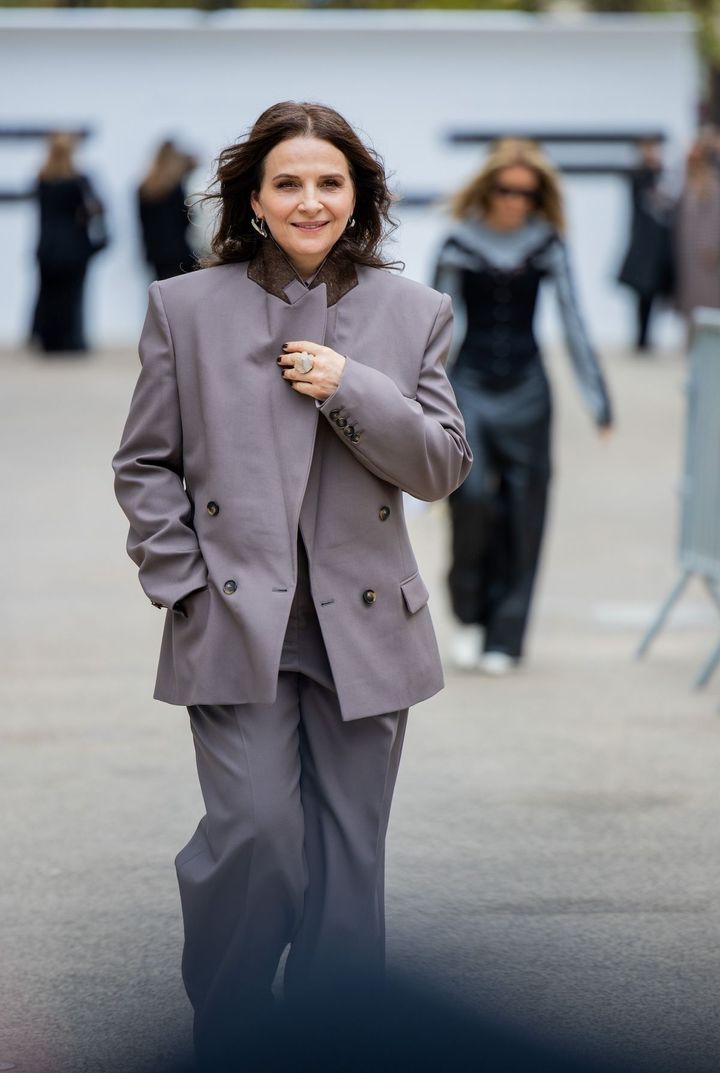 女優のジュリエット・ビノシュは、トレンドのアーストーンのセットアップで王道ハンサムなスタイリングを披露。ラペルを立てて肌見せを抑えたコーディネートの時は、大ぶりのリングとイヤリングで華を添えるのがポイントだ。