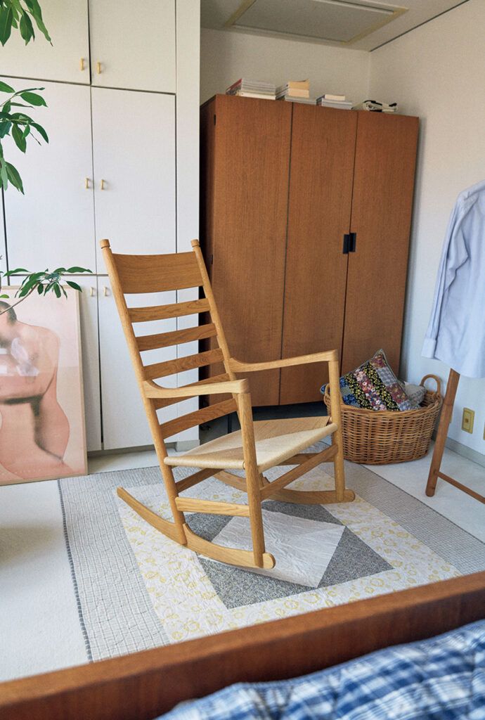 直線的でハイバック。古典的なシェーカースタイルを踏襲しながら、今日のインテリアに溶け込むモダンさも同居する。ハンス J. ウェグナーが手がけたロッキングチェア「CH45」は、そんなタイムレスな魅力を持つ一脚だ。背面側に大きく揺れるから座った瞬間からふっと力が抜けて、ずっともたれていたくなる。¥322,300(カール・ハンセン&サン/カール・ハンセン&サン 東京本店 03−5413−5421) クッション(手前)¥38,500(A.P.C. QUILTS/アー・ペー・セー カスタマーサービス 0120−500−990) その他スタイリスト私物