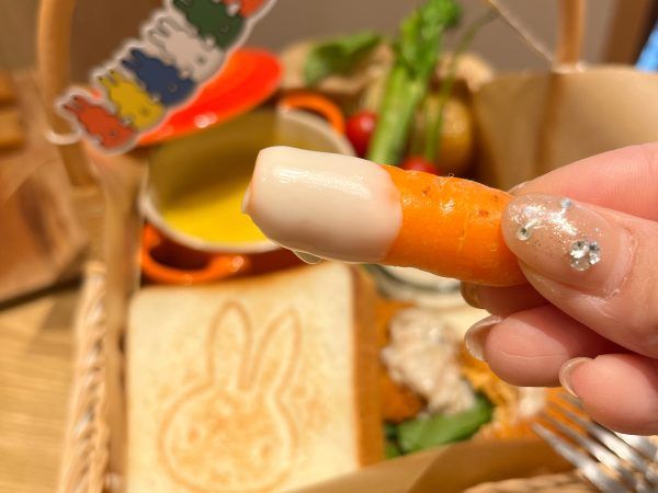 にんじんを食べていると、ミッフィーのお友だちになった気分に♪ バーニャカウダ風ソースが美味しくて、子どもでもどんどん野菜を食べてくれそうです。