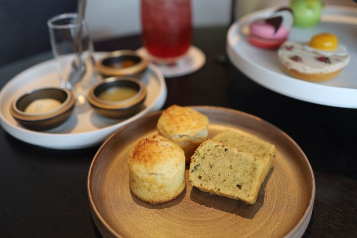 スコーン2種/左:スコーン、右:ローズマリーとフリアリエッリのパウンドケーキ、ジャムとクロテッドクリーム