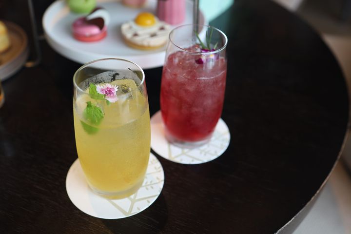 「ジャルディーニ メディチェイ 」のフレグランスカラーに合わせた季節のティーモクテル/左:フォールトワイライト(カモミールティー、マンダリンシロップ、エルダーフラワーシロップ)、右:セレラ リラ(ジャスミンティー、グレープジュース、エルダーフラワーシロップ)