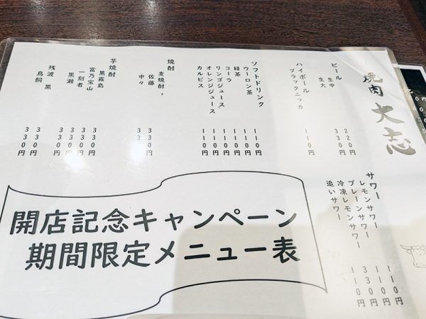 大志では今、開店記念キャンペーンでドリンクが格安になっています。 生ビール(中)は220円、レモンサワーやハイボール、ソフトドリンクは110円。 ランチタイムもディナータイムもこの価格なので、お得なうちにぜひ!