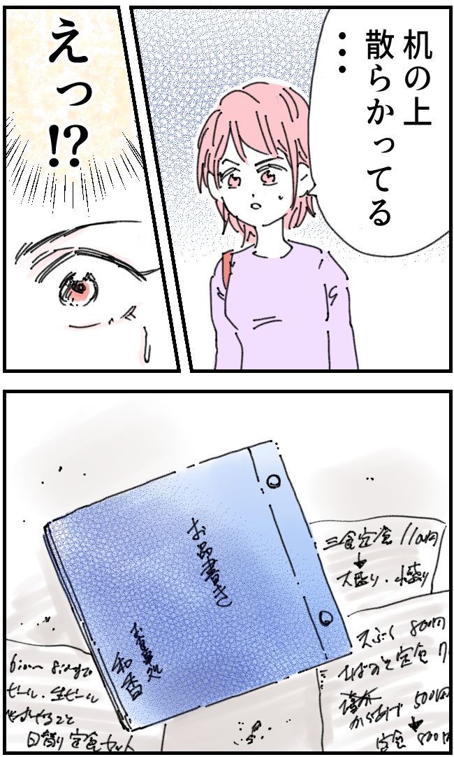 「机の上、散らかってる・・」机の上に広げられた紙を見て「えっ!?」と驚くかおりさん、そこには、かおりさんの両親がやっているお店「お食事処 和香」のお品書きが置いてありました。