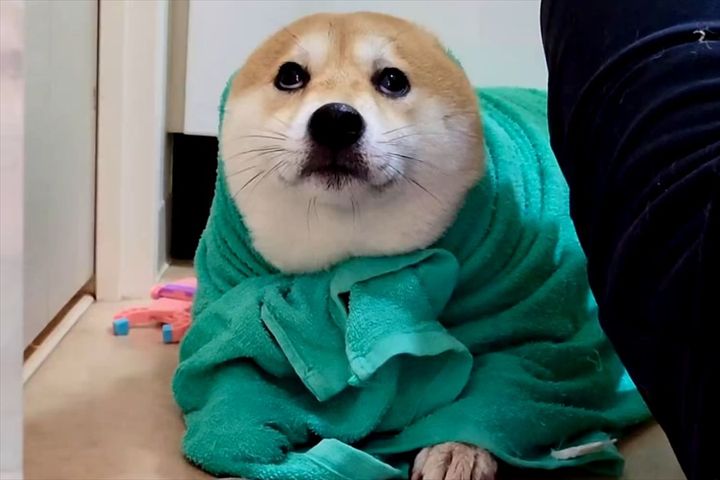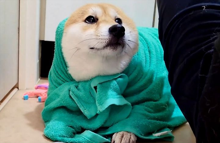 お風呂から上がったばかりの豆柴。 バスタオルにくるまれたその姿が、アザラシに見えてかわいいと反響を呼んでいます!