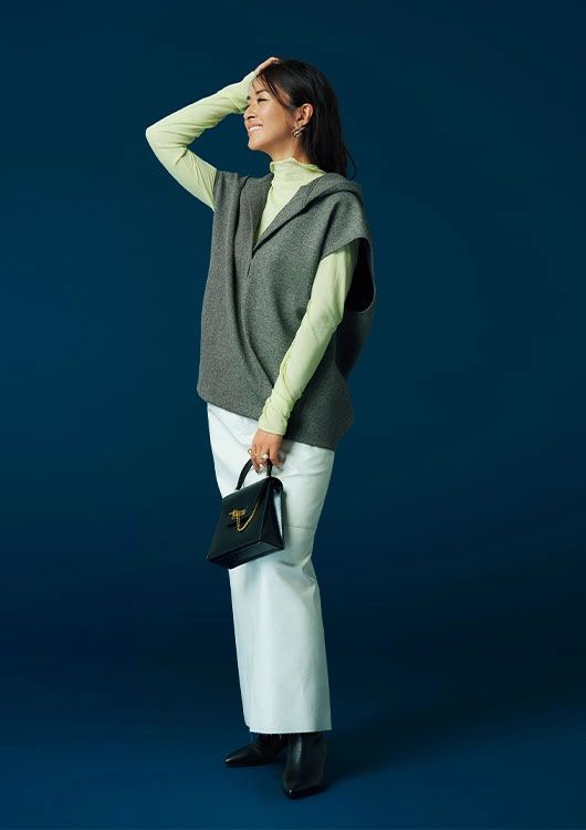 シアーなカットソーに重ねたのは、フード付きのボリューミィなベスト。丸みのあるシルエットが新鮮で、日常コーデのマンネリ化を打破できそう!