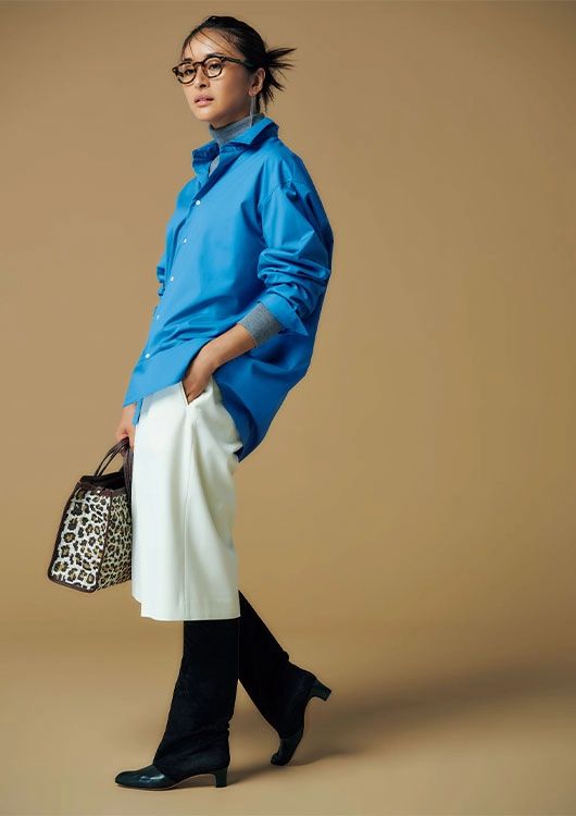 シャツ¥18,700、ニット14,300、パンツ¥19,800/以上ミースロエ メガネ¥17,600/ランバンオンブルー(デリーゴジャパン) ピアス¥36,300、リング¥99,000/ともにヴァガス(イセタンサローネ東京) バッグ¥58,300/アヴァケーション(ノーベルバ) ロングブーツ¥99,000/ネブローニ