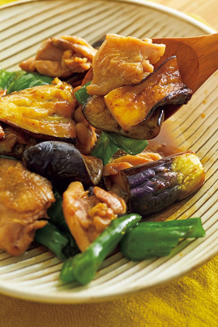 フライパンに、鶏肉を皮目を下にして並べる。ふたをして中火にかけ、2分ほど焼く。ふたを取り、鶏肉を返してピーマンを加え、2分ほど焼く。合わせ調味料を加えて煮立たせながらからめ、(2)のなすを戻し入れて汁けがほぼなくなるまで炒め合わせる。
