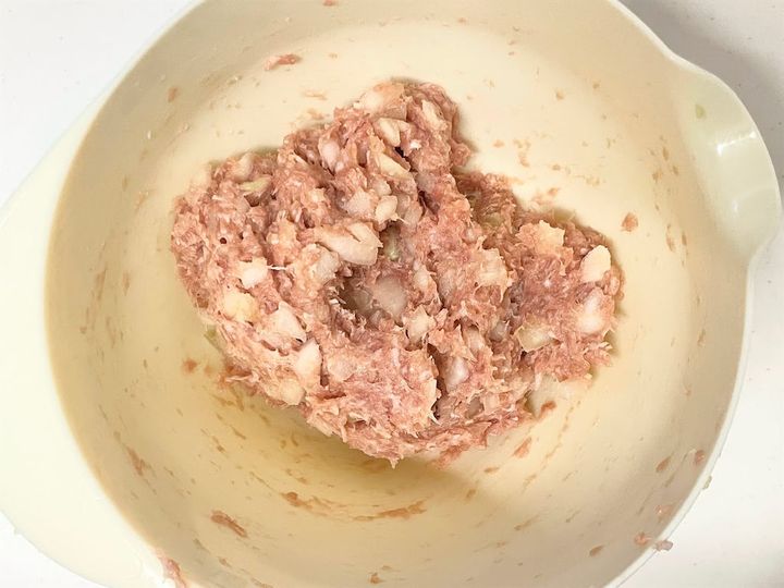 1. ボウルにひき肉、玉ねぎ、[A]を入れます。甘めが好きなら砂糖小さじ1を入れてくださいね。