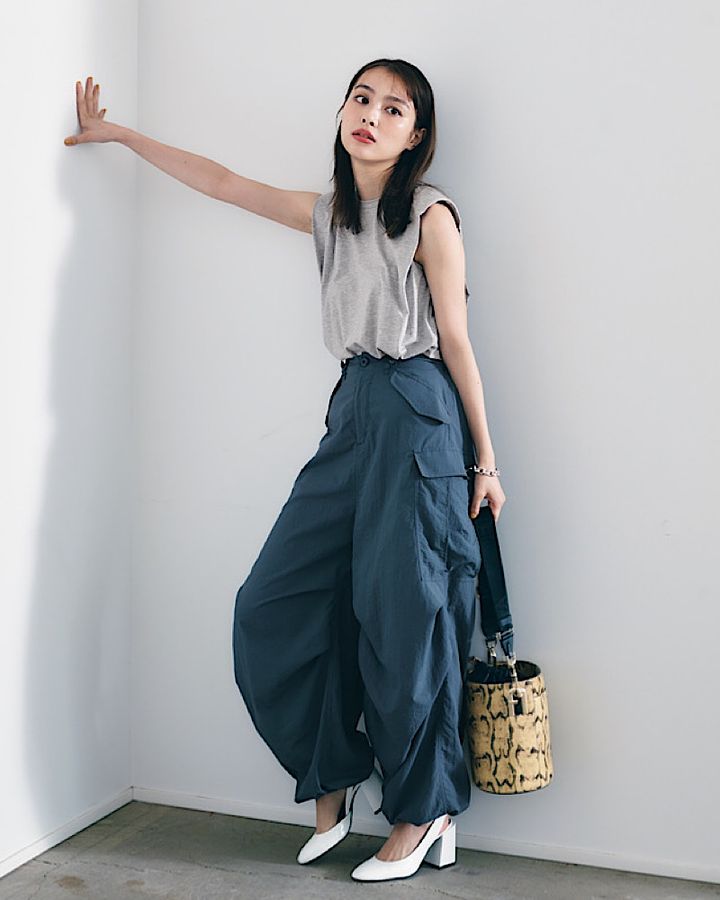 8月27日(金)、トレンドの「パワーショルダー」Tシャツは、コンパクトなノースリタイプで取り入れれば難なくクリア。メンズライクなボリュームワークパンツを合わせてマニッシュに着こなすのが、今っぽさの決め手です。パンツが太めなぶん、足元は白パンプスでキレイめにまとめると◎