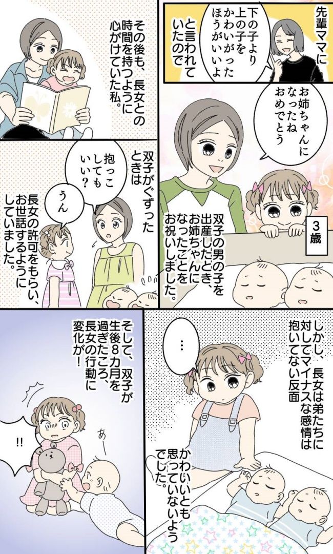先輩ママから、「下の子が生まれたら、上の子をもっとかわいがってあげたほうがいいよ」と聞いていました。そのため、私が双子の男の子を出産し自宅に戻った際、3歳の長女に「お姉ちゃんになったね。おめでとう」とお姉ちゃんになったことをお祝いしてあげました。