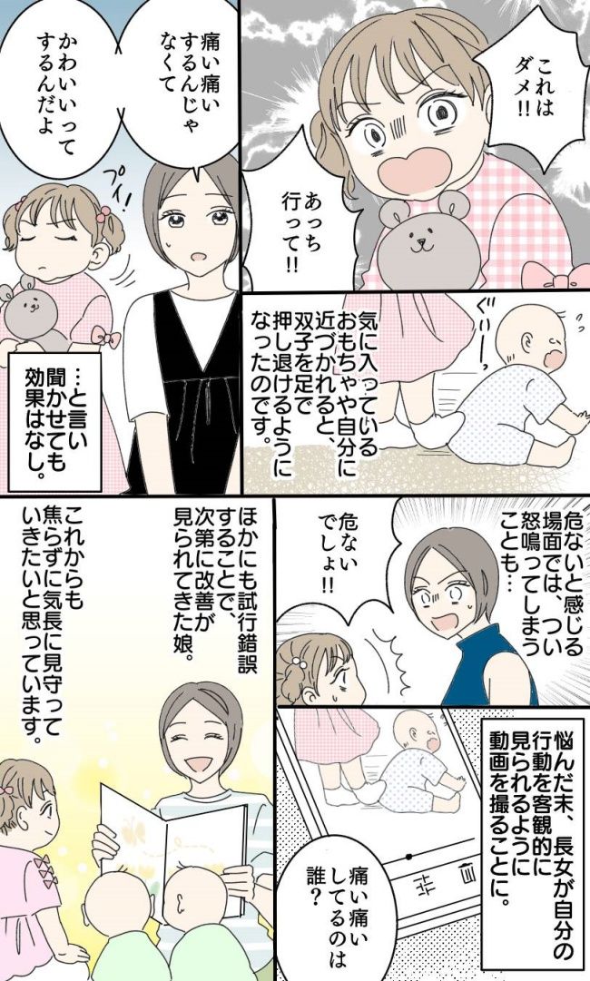 改善方法をいろいろ調べましたが、良い方法が見つからず……。悩んだ末に長女の行動を動画で撮影し「弟に痛い痛いしている人は誰?」と長女に見せ、客観的に自分の行動を見られるようにしました。また、「みんなで一緒に遊ぼう」と双子を含めた4人で遊ぶようにしています。試行錯誤しながらも少しずつ改善してきましたが、焦らず気長に見守っていきたいと思っています。