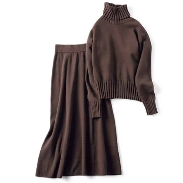 ニットアップは旬度の高いブラウンを。タートルネックニット¥9,990〈税込〉スカート¥10,900〈税込〉(ともにバナナ・リパブリック)