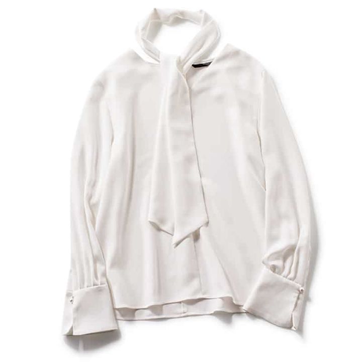 とろみのあるフェミニンな白ブラウスは、ボウタイのありなしで印象がチェンジする2WAY仕様。ボウタイ付きブラウス¥21,000(BOSCH)
