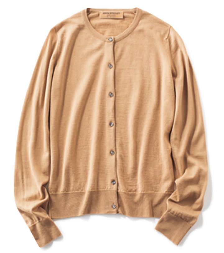 トラッドアイテムの代表。ニットのように一枚で着るのもあり。カーディガン¥34,000(JOHN SMEDLEY forANAYI/essence of ANAYI)