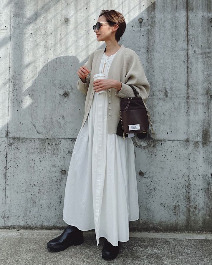 「ボタンを開けて羽織りとして着用しました。長すぎない丈感なので、ロングワンピに合わせてもバランスよくまとまります。にごりない真っ白ワンピと、上品なベージュカーディガンの組み合わせが大好き♡全体がぼやけて見えないように、黒ブーツとマルジェラのチェーンバッグでキリッと引き締めました」(岡本さん)