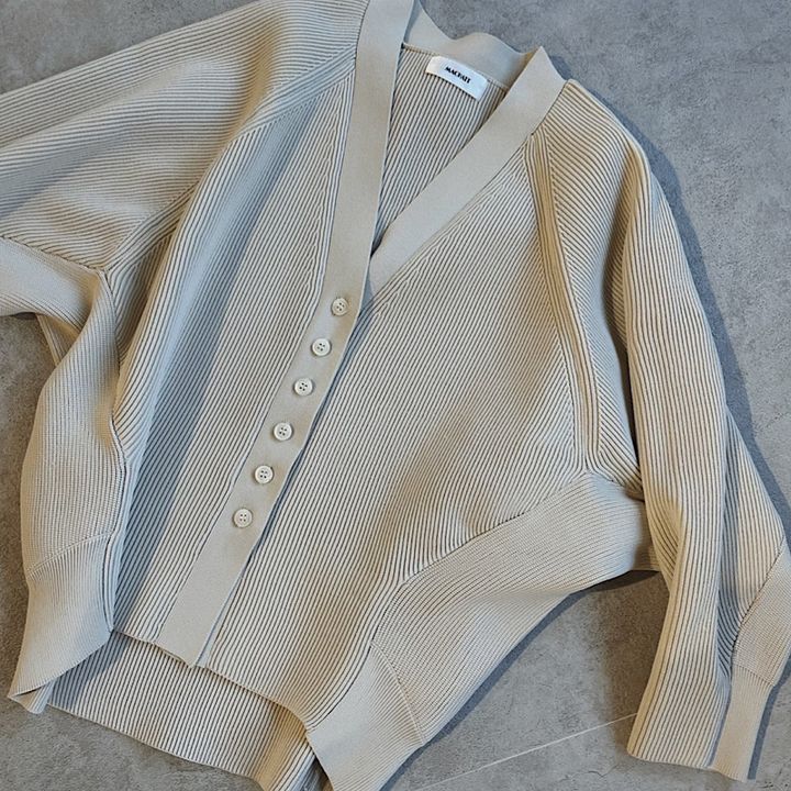「『MACHATT(マチャット)』のカーディガンは、サラッとした肌触りのアモッサ素材が使われていることで、ほっこりしないのが嬉しいところ。絶妙な切り替えデザインや、ドルマンスリーブのおかげで華奢見え効果も抜群です」(岡本さん)