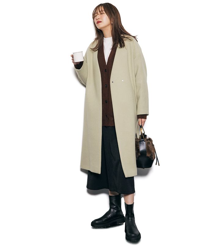 スエットトップス[メンズ]¥1,990(UNIQLO)キャミワンピ¥6,589(オペーク・クリップ)ノーカラーウールコート¥29,700(グリーンレーベル リラクシング/ユナイテッドアローズグリーンレーベル リラクシング 自由が丘店)バッグ¥36,300(ヴィオラドーロ/ピーチ)ブーツ¥9,990(マンゴ)イヤリング¥3,150(アビステ)