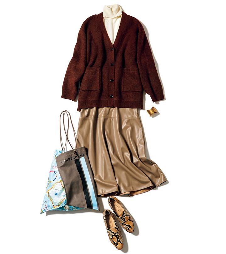 白タートルニット¥1,990(無印良品/無印良品 銀座)ベージュフレアスカート¥8,990(アンフィーロ/オンワード樫山)バッグ¥19,800(マニプリ)シューズ¥25,300(ファビオ ルスコーニ &ウォッシュ/WASH ルミネ横浜店)バングル¥29,700(ソコ/ZUTTOHOLIC)