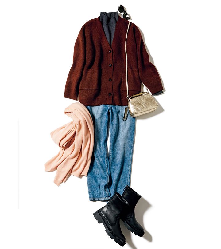 トップス¥5,990(Gap/Gap新宿フラッグス店)ストレートデニムパンツ¥4,950(グローバルワーク/アダストリア)バッグ¥25,300(ジャンニ キアリーニ/ジャンニ キアリーニ 銀座店)ストール¥59,400(アソース メレ/アイネックス)ブーツ¥9,990(マンゴ)サングラス¥5,500(JINS/JINSカスタマーサポートセンター)