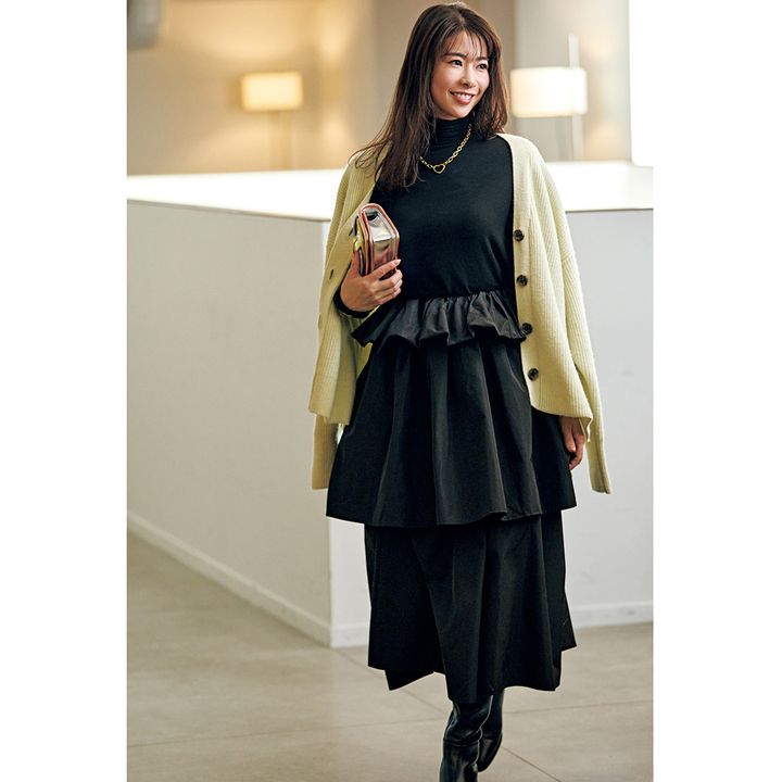 ④コクーン型アウターならフレアスカートも大人の甘さに