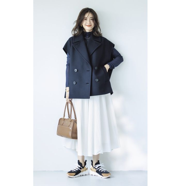 メンズっぽさを連想させるオーバーサイズのアウターが、フレアスカートのフェミニンさを洗練感のある大人の甘さに昇華。