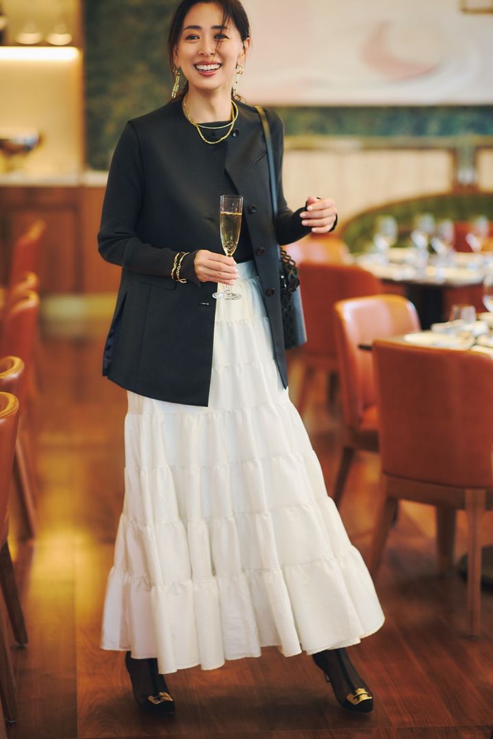 ⑥カジュアルシーンにもドラマティックなスカートが映える