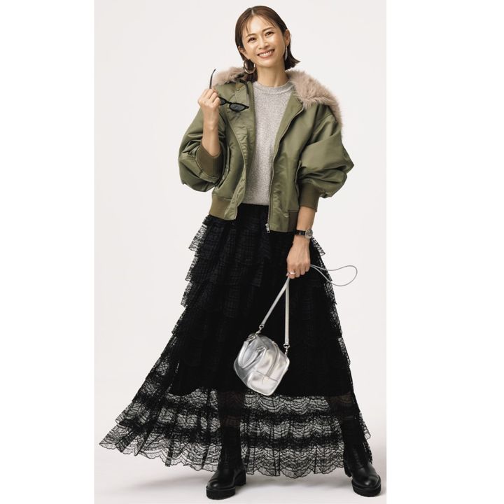 量感のあるティアードスカートは短か丈ブルゾンでバランスよく。