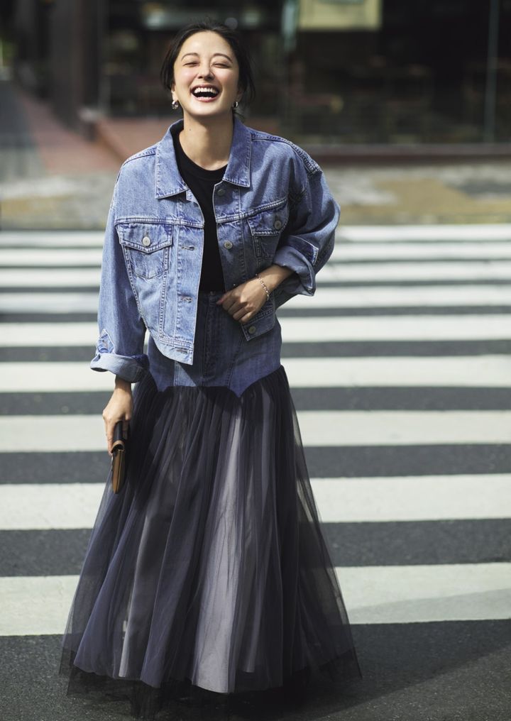 デニムジャケットがチュールスカートの甘さを程よく調整。