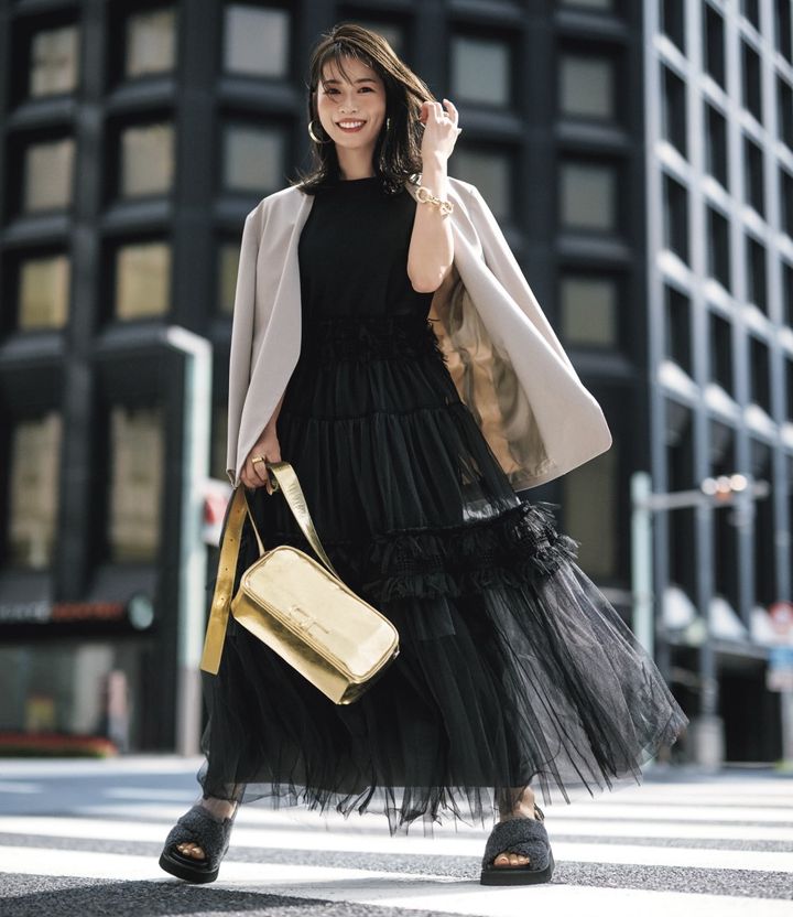 ジャケット¥55,000(ウィム ガゼット/ウィム ガゼット 青山店)ワンピース¥27,500(THIRD MAGAZINE)チュールスカート¥24,200(メゾンスペシャル/メゾンスペシャル 青山店)バッグ¥9,900(アダム エ ロペ)サンダル¥53,900(サクラ/インターリブ)ピアス¥15,400ブレスレット¥26,400(ともにワンエーアールバイウノアエレ/ウノアエレ ジャパン)2 本リング¥21,230(ソコ/ZUTTOHOLIC)