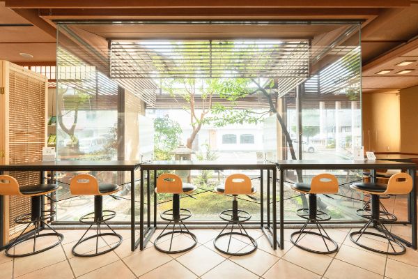 店内に入ると、ガラス越しに雰囲気のいい坪庭が。席は坪庭をぐるりと囲むように配置しているので、庭を眺めながらイートインが楽しめます。