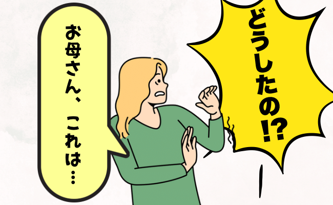 数日後、友人は約1年ぶりに両親に会うため実家へ。実家に到着すると、「いらっしゃい、早く上がりなさい」と母が出迎えてくれます。友人はパンプスを脱ぎ、玄関に上がりました。すると早々、母が驚いた表情を浮かべながら「どうしたの、その足の指! どっかにぶつけたの?」と、友人の返事も聞く間もなく「とりあえず座って、救急箱持ってくるから」と、慌てて救急箱を取りに行ってしまったのです。