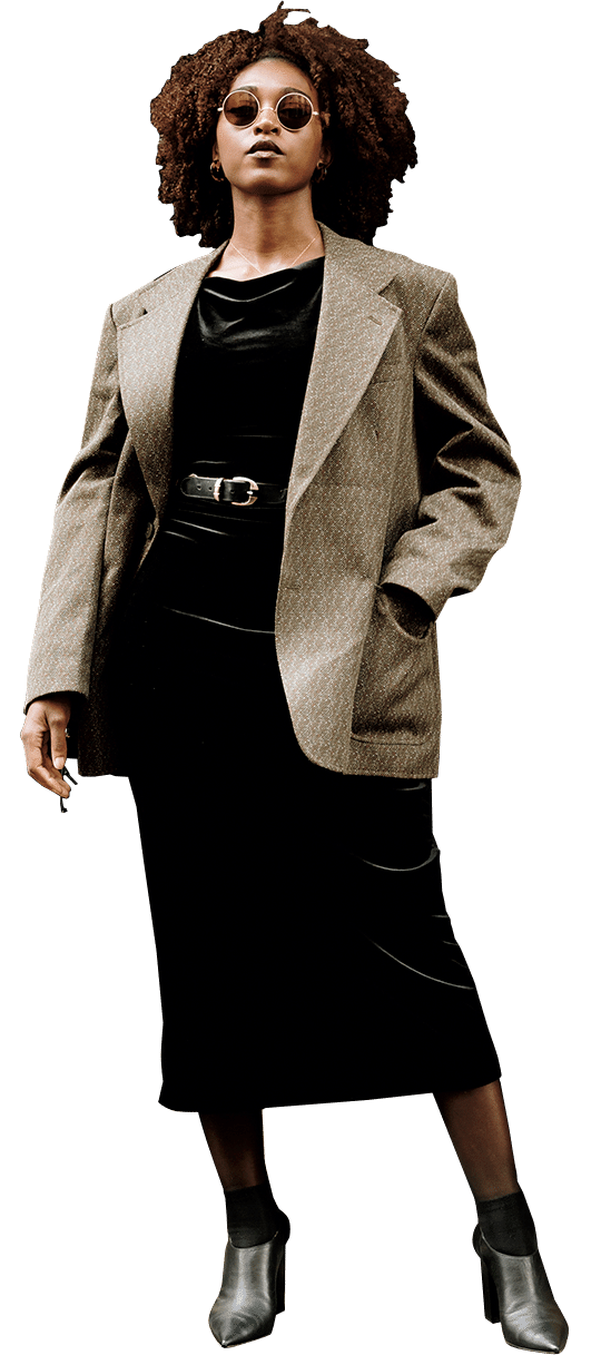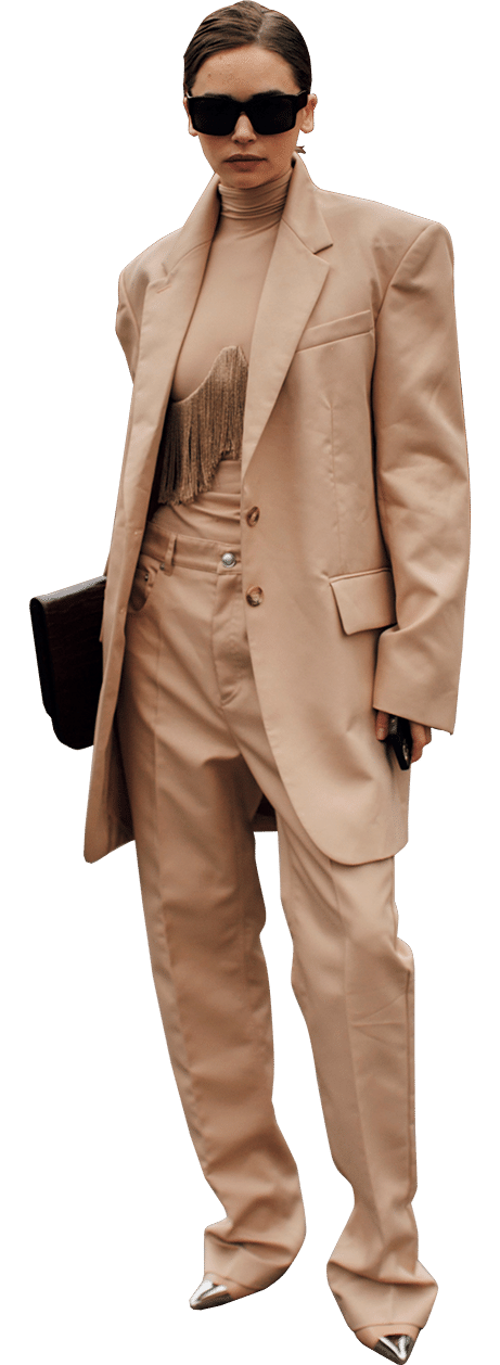 オールベージュのヌーディな着こなしが超クール! インナーのフリンジディテールをきかせて表情のあるワントーンに。