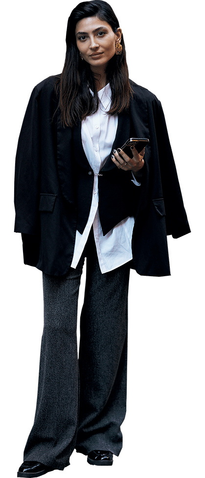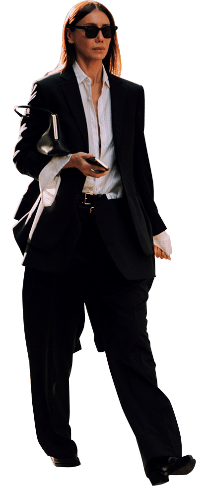 細身ジャケットに太めのスラックスが絶妙なバランス。白シャツを差して一層ハンサムに。