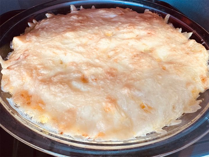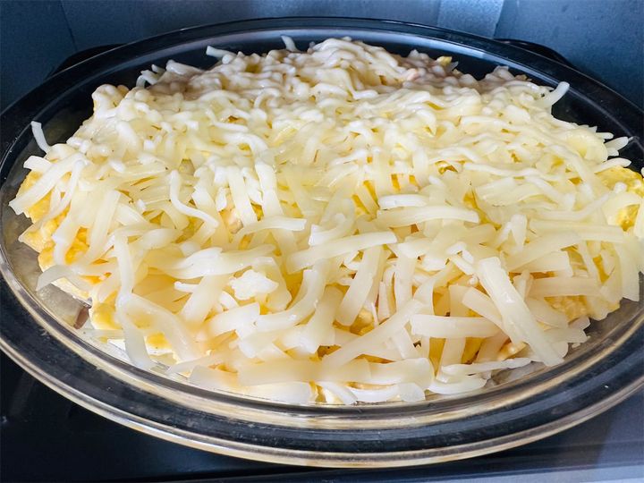 4.耐熱容器に3を入れて、とけるチーズをかける。200℃で予熱したオーブンで10分くらい焼いて完成。