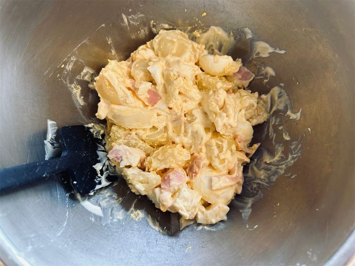 3.1のじゃがいもと2のゆで卵、ベーコンを合わせ、塩、こしょう、マヨネーズを加えて混ぜる。