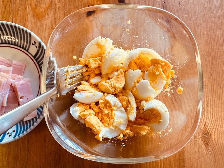 2.ゆで卵はフォークで大きめに潰す。ベーコンは1cm幅に切る。