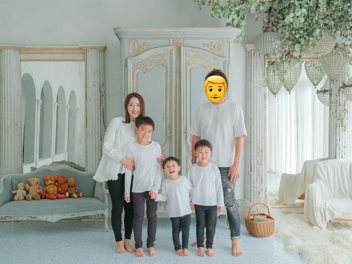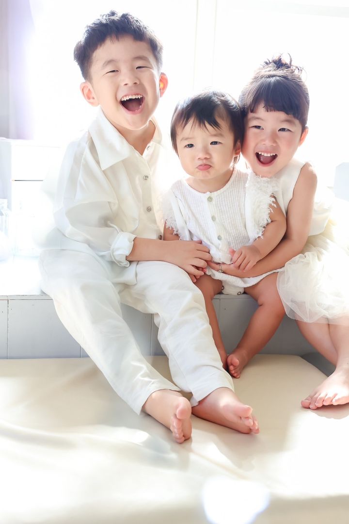 「子どもたちだけの着物の写真も撮りましたが、家族写真はナチュラルな感じにしたかったので全員普段と変わらない服にしました。シンプルなTシャツとパンツにした子どもたちに合わせ、親も同じような組み合わせに。今まで撮影したお誕生日写真などもモノトーンで統一して部屋に飾っているので、今回もインテリアに合うよう同じようにしました」松本彩花さん・35歳/159㎝(9歳と6歳と3歳の男の子ママ)