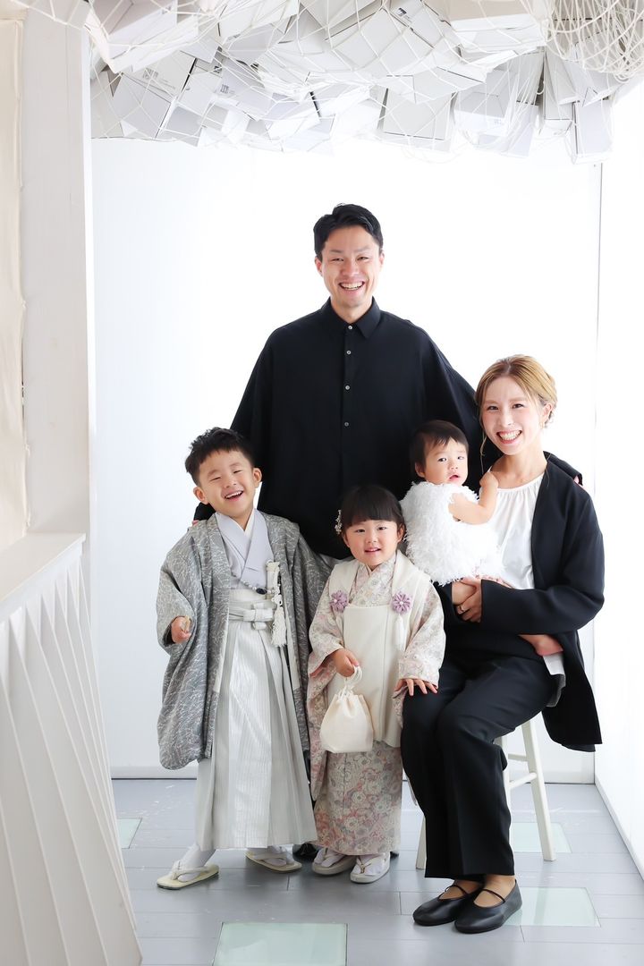 「お詣りをする日は着物の予定だったのと、前撮りは1歳になる次男のバースデーフォトを兼ねていたのでシンプルな普段着に。暑さを考えてお詣りは前撮りの2カ月先にして、衣装を二度借りずに済むようにしました。ペールトーンの淡い色を基調としたスタジオの雰囲気に合うよう、子どもたちは淡い色の着物を選び、親は黒多めのモノトーンで着物が引き立つように意識。子どもが洋装の写真も撮影したので、雰囲気が変わるよう、上着だけ脱いで全員白系で統一しました」吉田幸奈さん・35歳/168㎝(6歳の男の子と4歳の女の子と2歳の男の子ママ)