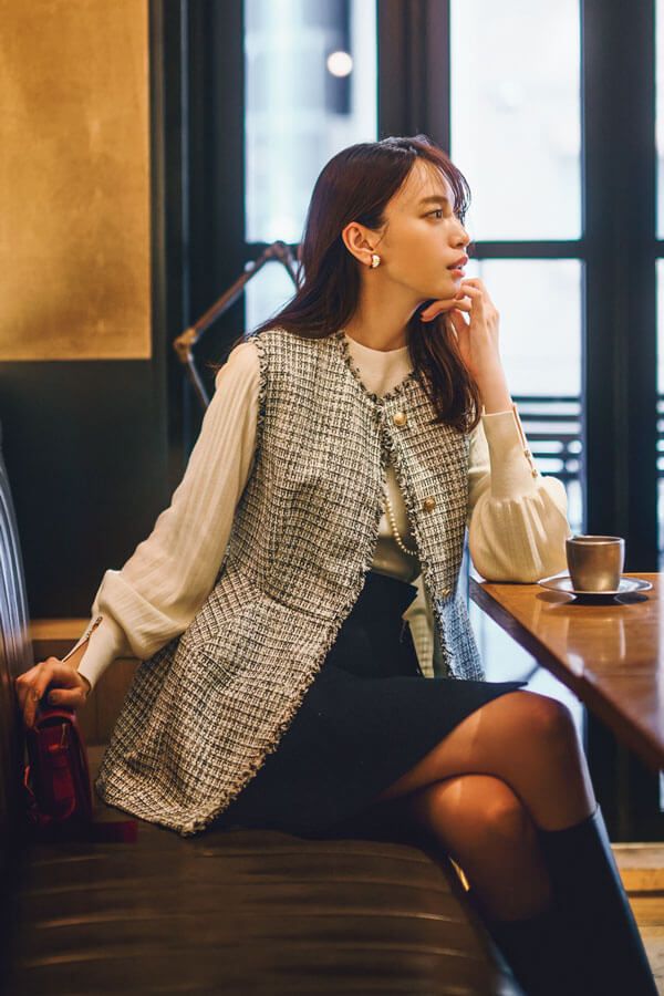 ツイードジレを主軸に、モノトーンでまとめてクラシカルな佇まいに。