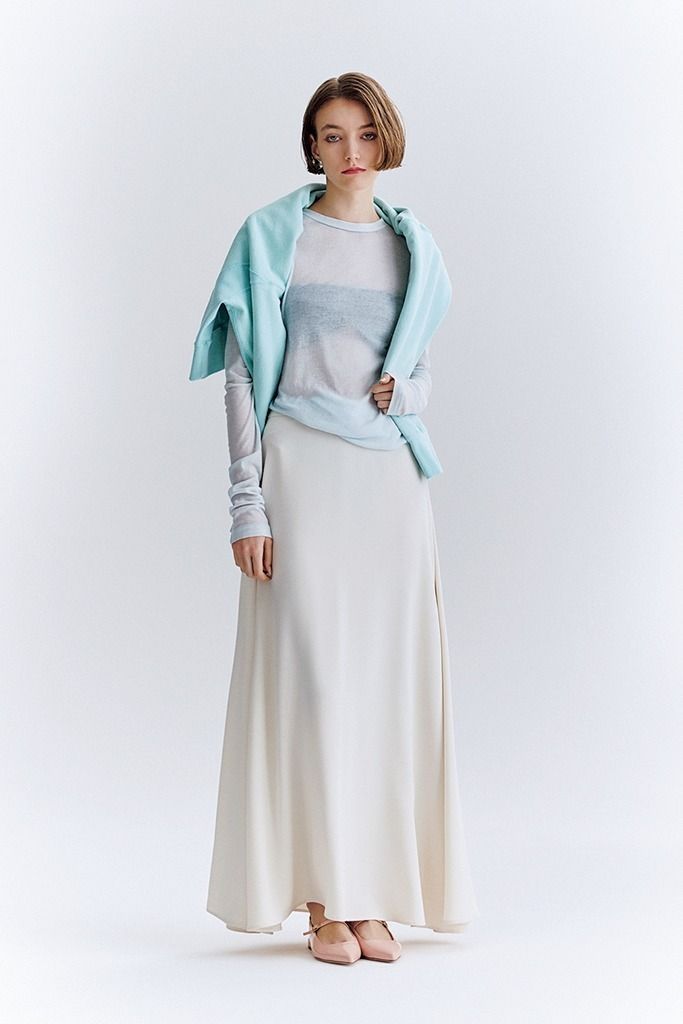 【POINT】ドレープのニュアンスが生き、白でも甘くない落ち着いたムードや陰影による奥行きをスカート1枚で獲得。そんな頼れるボトムを相棒にトップスは澄んだブルーをダブルづかい。装いに軽さを出しつつ、質感の差でメリハリづけてぼやけたシルエットをキリっと調整。