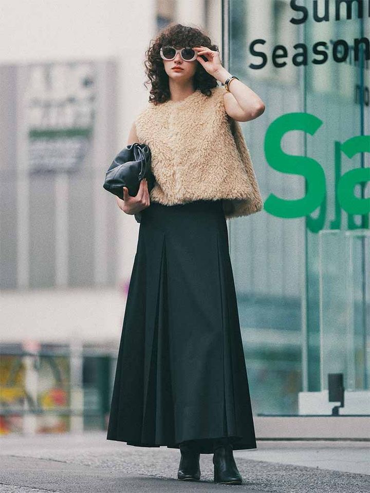 【POINT】ボリューミィなベストは、フレアスカートで重みを分散して全体のバランスを調節。タックによって生まれる縦の折り目がキレを出せるため、トップスを問わずシャープなまま。