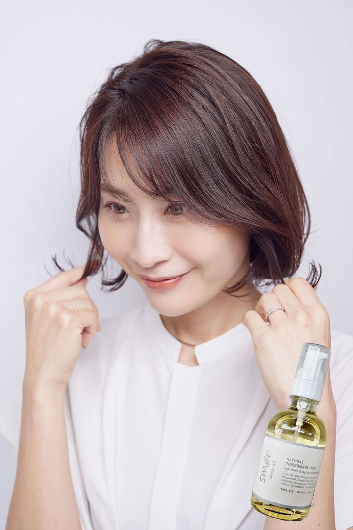 根元を立ち上げるようにドライヤーで乾かし、顔まわりはややリバースに動きをつけます。もみあげの毛束をハネさせると可愛い。質感が重めのオイルをなじませて完成。スメール ナチュラル ディープ オイル 100ml ¥3,300/NORA()