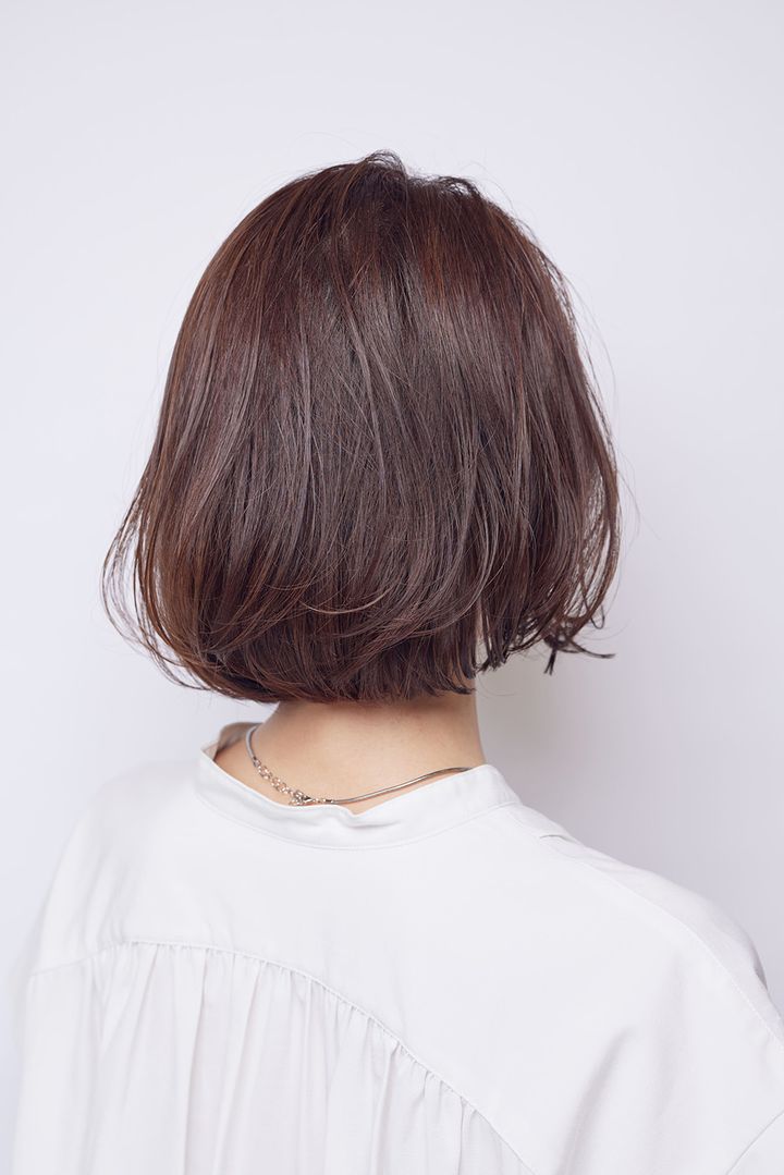 カラーは8レベルのフォギーベージュを。上の写真の通り透け感とツヤが絶妙で、季節が深まる秋口にぴったり。髪がつぶれやすい人はトップにポイントパーマをかけるのもおすすめ。