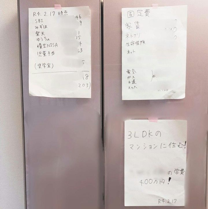 さすがに本格的に家計見直しをしなければいけないと思い、まず始めたのが家の資産状況を紙に書き出すこと。貯金や月の家計簿をA4のコピー用紙に大きく書き、冷蔵庫(わが家では一番目立つところ)に貼っておくことにしました。