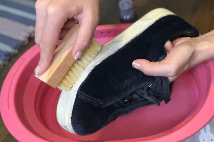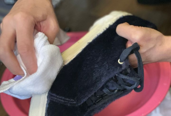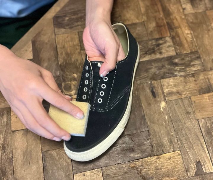 ブラシを再度水に浸したら、余計な水分を切って泡立てながらブラッシングしていきます。*今回はフォクシングテープ部分のみなので、靴ひもはしたままになっています。
