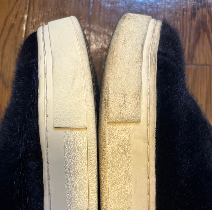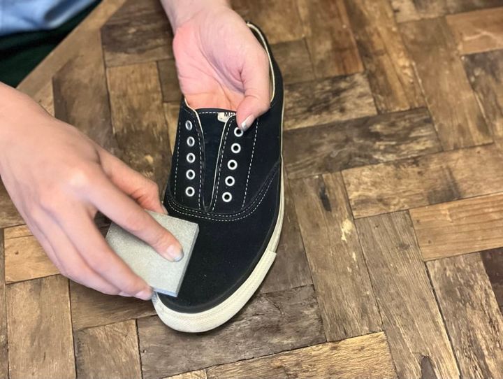 まずはライトグレーの発砲ゴム面を軽く擦り、汚れやホコリなどを落としていきます。その際に毛足を逆立てるようにすると落ちやすいですよ。*スエード靴がなく、今回はスニーカーで代用しています。