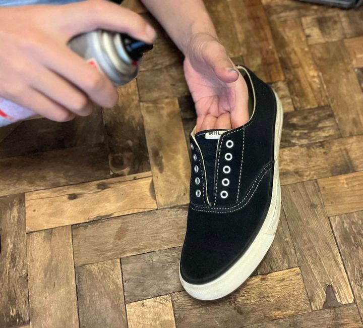 最後にスエード専用の栄養・防水スプレーを均一に吹きかけていきます。30分以上放置して完全に乾いたら、発砲ゴム面で一定方向にブラッシングして毛並みを整えたらフィニッシュ。