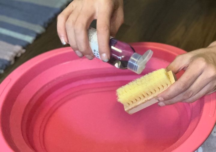 ボウルやバケツなどに張った水にブラシを浸して、付属の洗剤をブラシにつけていきます。