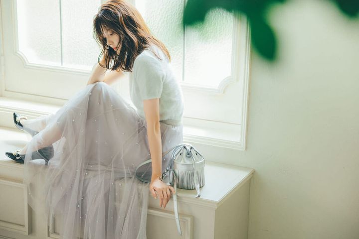 パールを加えることで、おなじみのチュールスカートにフェミニンな気品をプラス。全身ニュアンストーンでまとめて、淡いパールの輝きを優しく際立たせて。
