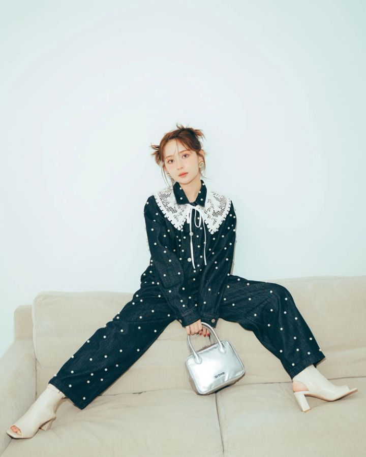 パールつきデニムジャケット 27,500円、パールつきデニムパンツ 18,700円/ともにPERNA(アンティローザ) つけえり 3,190円/UNIQKY イヤリング 7,980円/アビステ バッグ 9,900円/アウトドアプロダクツ(アウトドアプロダクツユージュアル シングス 中目黒店) ショートブーツ 12,980円/RANDA